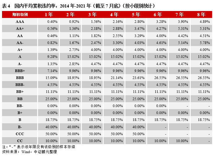 2.相較于穆迪全球,我國高級別違約率偏高,低級別違約率偏低,呈“平坦”化分布。AAA的各年限違約率較穆迪均偏高,且第一年就有違約,而穆迪在第二年后才出現違約;低評級方面,例如:國內B級8年期平均累積違約率為21.74%,低于穆迪的29.65%。這說明相較于穆迪的國際評級序列來說,我國部分高評級主體的級別是虛高的,其實際信用風險高于其評定級別的信用風險定義,應降低這部分主體的評級級別,從而使高級別違約率回歸至合理水平。而低級別違約率偏低,一是因為樣本不足,統計結果的統計意義不強;二是跟早年我國信用債券市場的“剛兌”思想有關,部分低評級主體在各方協調下最終兌付,使得低評級違約率較全球水平來說偏低;另外,當虛高級別主體的評級下調后,一定程度上也會提升低評級違約率。