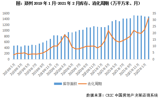 CRIC數(shù)據(jù)顯示,鄭州新房狹義庫存規(guī)模就已接近1500萬平方米,消化周期超過20個(gè)月,2021年2月,由于成交持續(xù)低位徘徊,新房庫存消化周期更是躍升至31個(gè)月。