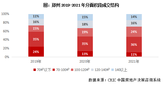 通讀新政全文還可以發(fā)現(xiàn),支持改善性需求有效釋放貫穿文件始終,新政為何要重點(diǎn)著墨改善性需求?原因在于鄭州新房的成交結(jié)構(gòu)中,剛需占主導(dǎo)地位,這也意味著改善性購房需求未來仍有較大釋放空間。2021年,鄭州100平方米以下新房成交套數(shù)占比接近50%,120平方米以下新房成交占比達(dá)到70%,而140-180平方米、180平方米以上改善、終改成交占比僅為11%和3%。