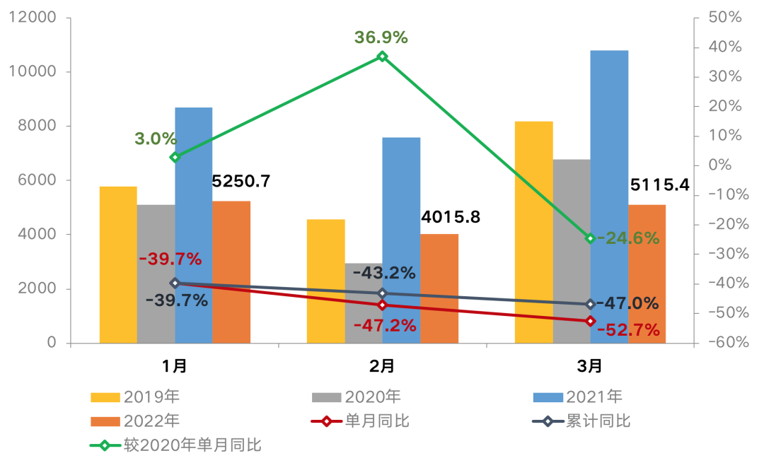 3月單月業績表現也印證了房地產行業持續的下行壓力。百強房企單月銷售操盤金額僅5115.4億元,環比雖增長27.4%,但增幅明顯低于往年同期。百強房企銷售業績同比降幅達到52.7%,較1、2兩月進一步擴大,其中較2月降幅擴大5.5個百分點;相比1月業績規模降低2.6%。