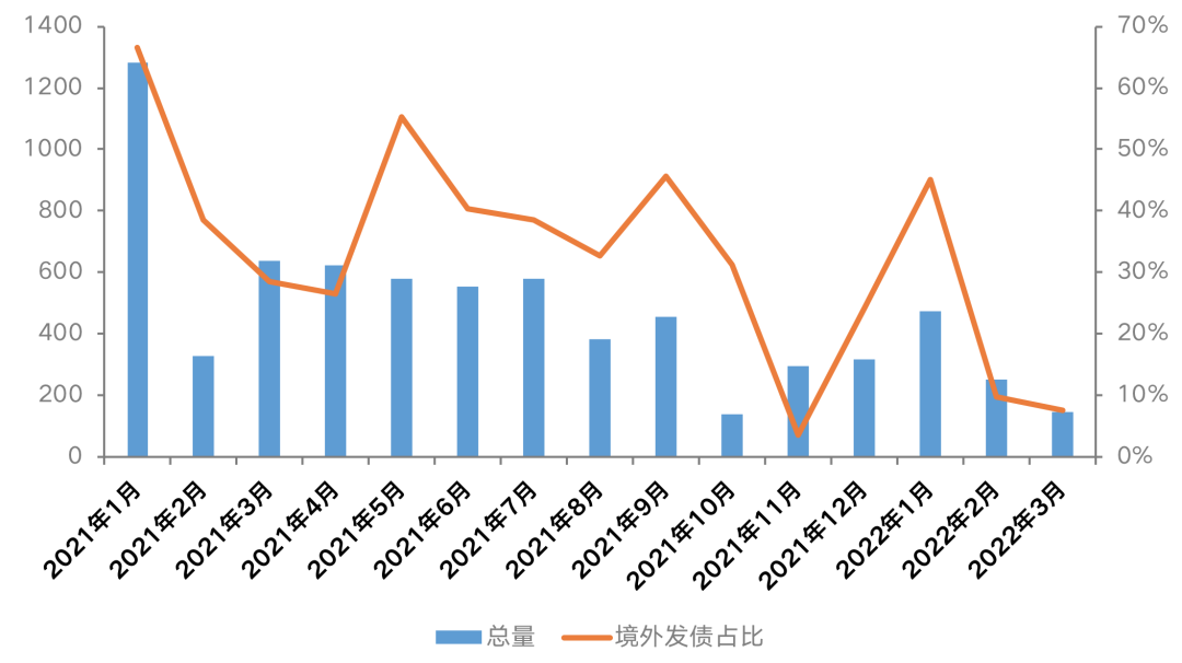 圖:2021年至2022年3月房企發債總量及境外債占比(億元)
