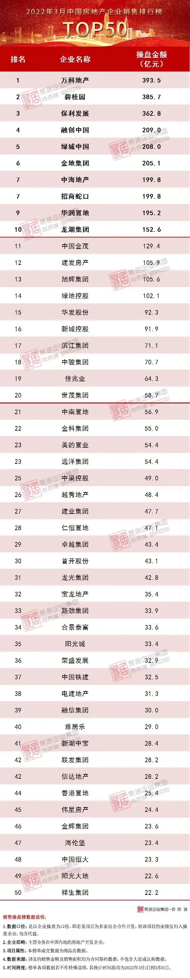 附:2022年3月中國房地產企業銷售排行榜TOP50