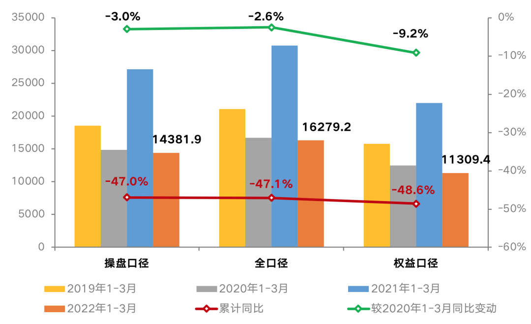 圖:2022年1-3月百強房企累計業績表現及同比變動(億元)