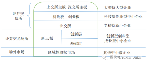 從企業(yè)數(shù)量和規(guī)模上來區(qū)分,常用金字塔來形容我國多層次資本市場結構:區(qū)域性股權市場為塔基,區(qū)域性市場、場外市場,但其擁有和服務著最海量的中小微企業(yè);新三板為塔中,全國性證券交易場所、場內(nèi)市場,服務廣大的創(chuàng)新型創(chuàng)業(yè)型成長型中小企業(yè),承擔承上啟下的重任;京滬深三交易所為塔尖,服務企業(yè)相對較少,但企業(yè)相對已很成熟。如果根據(jù)市場的重要性來看,又是一個倒金字塔結構,塔尖對我國經(jīng)濟的重要性最大。