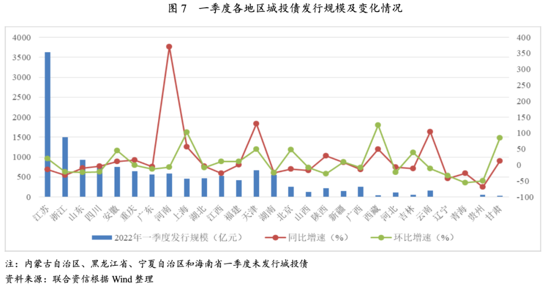 一季度,江蘇城投債發(fā)行規(guī)模仍大幅領(lǐng)先其他地區(qū),不同地區(qū)城投債發(fā)行規(guī)模分化明顯。河南“永煤事件”影響逐步消退,天津市政府多次召開懇談會(huì),兩地融資環(huán)境有所修復(fù),城投債發(fā)行規(guī)模同比大幅上升。而江蘇、浙江、江西和湖南發(fā)行規(guī)模同比有所萎縮,主要系區(qū)縣級(jí)城投企業(yè)較多,嚴(yán)監(jiān)管下區(qū)縣級(jí)城投債發(fā)行受到一定限制。此外,貴州、青海、遼寧等地發(fā)行規(guī)模明顯下降。凈融資方面,主要發(fā)債省份凈融資規(guī)模同比和環(huán)比均出現(xiàn)不同程度收縮,河南、天津、吉林城投債凈融資轉(zhuǎn)正,東北、西北和西南地區(qū)城投債凈融資存在缺口,貴州、甘肅、遼寧、內(nèi)蒙古等地城投債融資延續(xù)2021年四季度以來凈流出狀態(tài),城投債余額持續(xù)收縮。