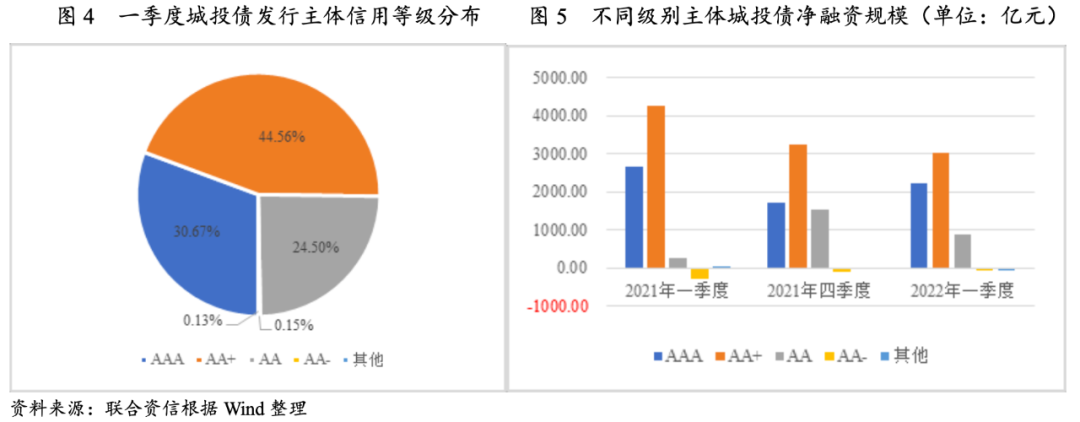 嚴(yán)監(jiān)管態(tài)勢延續(xù),一季度城投債發(fā)行規(guī)模及凈融資規(guī)模均有所下降。受滬深交易所公司債審核趨嚴(yán)影響,城投企業(yè)公司債終止審核規(guī)模較大,發(fā)行規(guī)模及凈融資規(guī)模明顯收縮;募集資金用途仍受到嚴(yán)格限制,超過90%用于償還債務(wù);區(qū)縣級(jí)城投企業(yè)受監(jiān)管影響較大,城投債凈融資大幅下降。