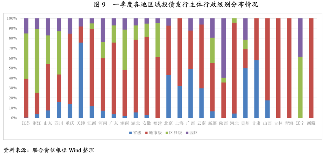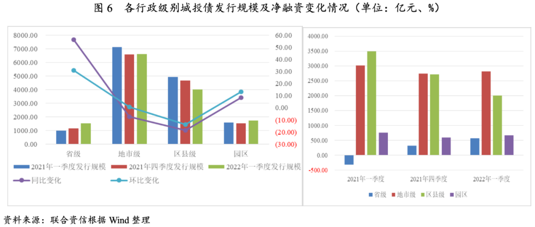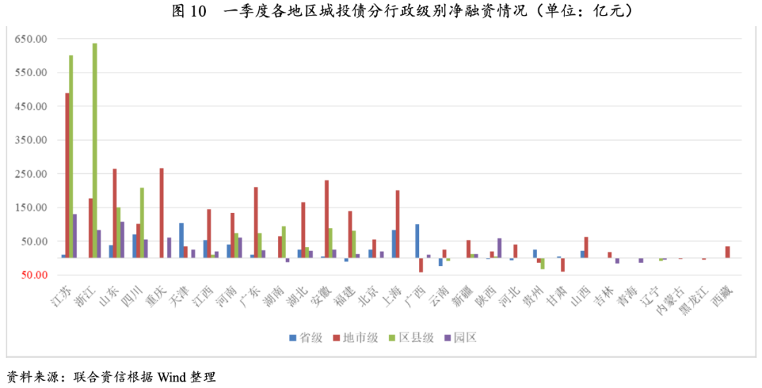 從行政級(jí)別上看,地市級(jí)和區(qū)縣級(jí)主體仍是城投債發(fā)行主力,一季度地市級(jí)和區(qū)縣級(jí)城投債發(fā)行規(guī)模占比分別為47.62%和28.96%。但區(qū)縣級(jí)主體發(fā)債受監(jiān)管限制影響更大,城投債發(fā)行規(guī)模同比和環(huán)比均呈萎縮態(tài)勢,降幅分別為18.55%和13.69%;省級(jí)主體發(fā)行規(guī)模同比和環(huán)比均快速擴(kuò)張,增幅分別為56.22%和30.90%。凈融資方面,區(qū)縣級(jí)城投債凈融資規(guī)模同比和環(huán)比分別下降42.53%和25.91%,降幅顯著。