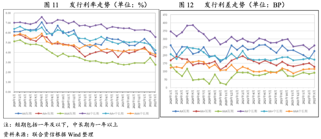 受益于穩(wěn)健貨幣政策的持續(xù)實(shí)施,2022年一季度,城投債發(fā)行利率和發(fā)行利差整體延續(xù)2021年的下行趨勢。分級(jí)別來看,除AA級(jí)和AA+級(jí)中長期城投債發(fā)行利率持續(xù)下降外,其他各等級(jí)城投債發(fā)行利率均表現(xiàn)為“先升后降”的倒“V”態(tài)勢;AA+級(jí)中長期和AAA級(jí)城投債發(fā)行利差表現(xiàn)較為平穩(wěn),AA級(jí)城投債發(fā)行利差呈“先降后升”的“V”型走勢。