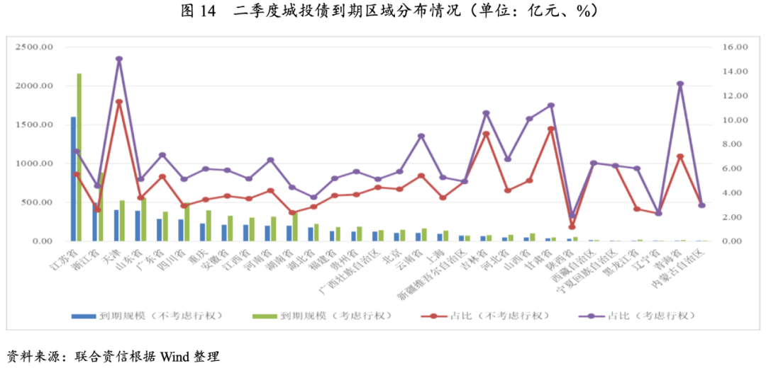 一季度城投債凈融資僅為二季度到期城投債規(guī)模(考慮含權(quán),下同)的0.72倍。具體來看,各省份差異較大,大部分省份一季度城投債凈融資無法覆蓋二季度到期規(guī)模,江蘇、天津、湖南、貴州和云南差額較大。