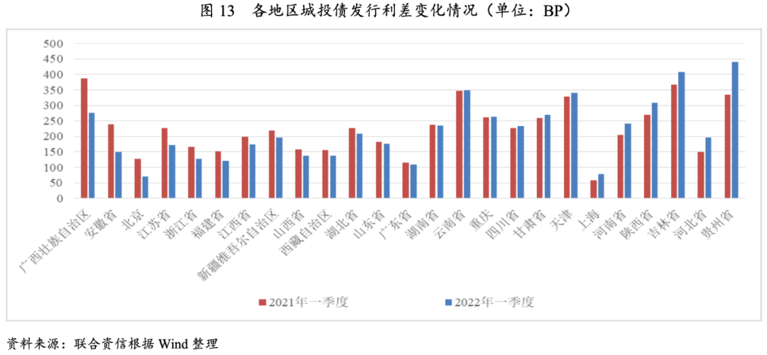 分區(qū)域來看,貴州、河南和陜西城投債整體發(fā)行利率同比上升,其他地區(qū)城投債發(fā)行利率均呈不同程度的下降。發(fā)行利差方面,貴州、河北、吉林、陜西和河南等地城投債發(fā)行利差同比均呈走擴(kuò)趨勢,其中貴州城投債發(fā)行利差同比上升超過100BP,陜西和河南區(qū)縣級(jí)及園區(qū)城投企業(yè)發(fā)行利差上行明顯,較2021年全年分別上升約50BP和20BP;安徽、北京、江蘇、浙江、福建等地區(qū)城投債發(fā)行利差均有所收窄,柳州市城投債發(fā)行占比明顯下降,帶動(dòng)廣西城投債發(fā)行利差下行。