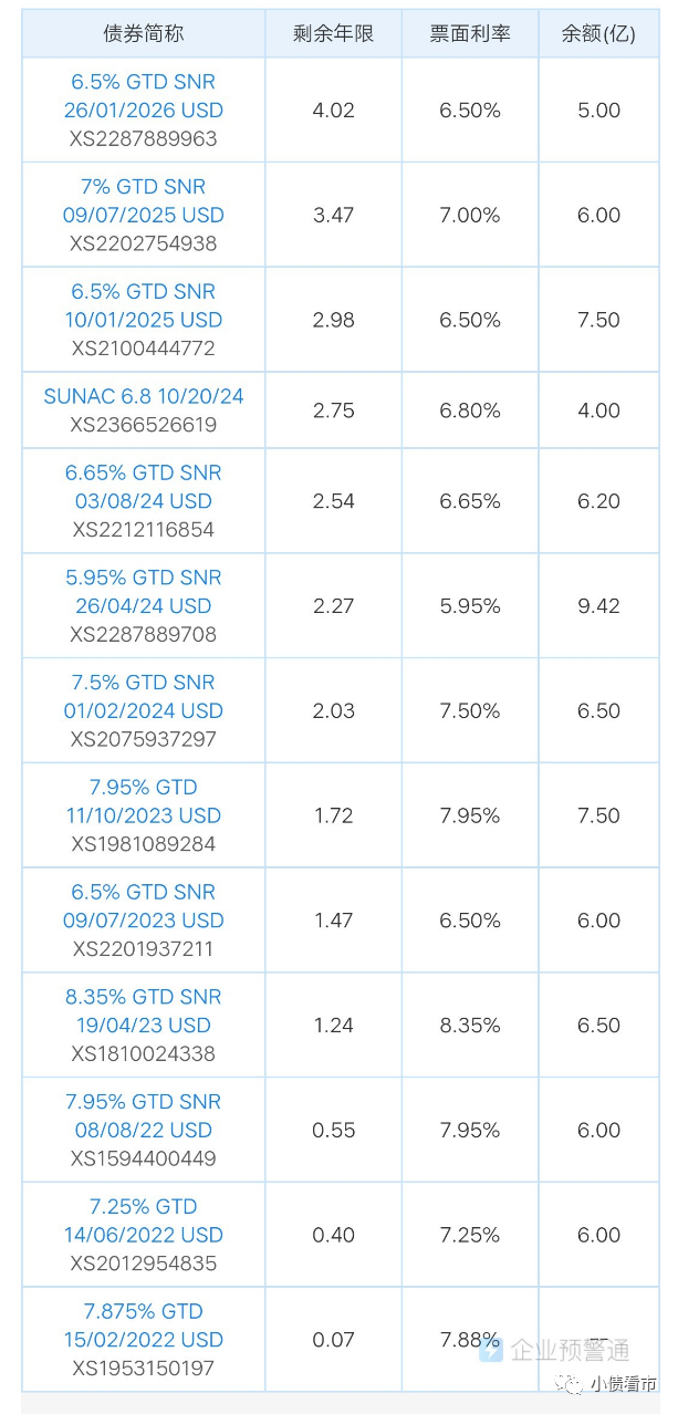 《小債看市》統(tǒng)計(jì),目前融創(chuàng)中國(guó)存續(xù)美元債12只,存續(xù)規(guī)模77.04億美元,票息在5.95%-8.35%之間,其中有兩只合計(jì)12億美元債分別將于今年6月和8月到期。