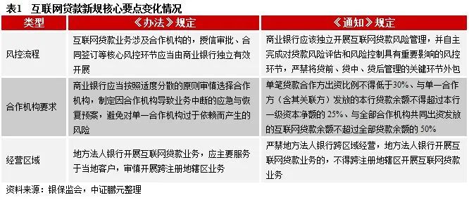 《通知》主要從以下四個方面對商業(yè)銀行互聯(lián)網(wǎng)貸款業(yè)務(wù)進行了規(guī)定:首先是明確銀行風控流程的獨立性,要求商業(yè)銀行應(yīng)該獨立開展互聯(lián)網(wǎng)貸款風險管理,并自主完成對貸款風險評估和風險控制具有重要影響的風控環(huán)節(jié),嚴禁將貸前、貸中、貸后管理的關(guān)鍵環(huán)節(jié)外包,相較于《辦法》中提出的“互聯(lián)網(wǎng)貸款業(yè)務(wù)涉及合作機構(gòu)的,授信審批、合同簽訂等核心風控環(huán)節(jié)應(yīng)當由商業(yè)銀行獨立有效開展”更為嚴苛。其次是明確規(guī)定了3項定量管理要求,即:單筆互聯(lián)網(wǎng)聯(lián)合貸款中合作方出資比例不得低于30%、與單一合作方(含其關(guān)聯(lián)方)發(fā)放的本行貸款余額不得超過本行一級資本凈額的25%、同全部合作機構(gòu)共同出資發(fā)放的互聯(lián)網(wǎng)貸款余額不超過全部貸款余額的50%,相較于《辦法》提出了更為具體的量化監(jiān)管指標約束。然后是嚴禁地方法人銀行跨區(qū)域經(jīng)營,地方法人銀行開展互聯(lián)網(wǎng)貸款業(yè)務(wù)的,不得跨注冊地轄區(qū)開展互聯(lián)網(wǎng)貸款業(yè)務(wù),這相較于《辦法》中的“地方法人銀行開展互聯(lián)網(wǎng)貸款業(yè)務(wù),應(yīng)主要服務(wù)于當?shù)乜蛻?,審慎開展跨注冊地轄區(qū)業(yè)務(wù)”有了更為嚴格的監(jiān)管意見。最后是設(shè)定了過渡期安排,對于出資比例標準和跨區(qū)域經(jīng)營的限制,實行“新老劃斷”,要求從2022年1月1日起的新發(fā)生業(yè)務(wù)依照新出資比例和區(qū)域要求執(zhí)行,對于存量業(yè)務(wù)自然結(jié)清;集中度風險管理、貸款總額限額管理的量化標準則要求在2022年7月17日前有序整改完畢,總體與《辦法》的過渡期銜接基本一致。