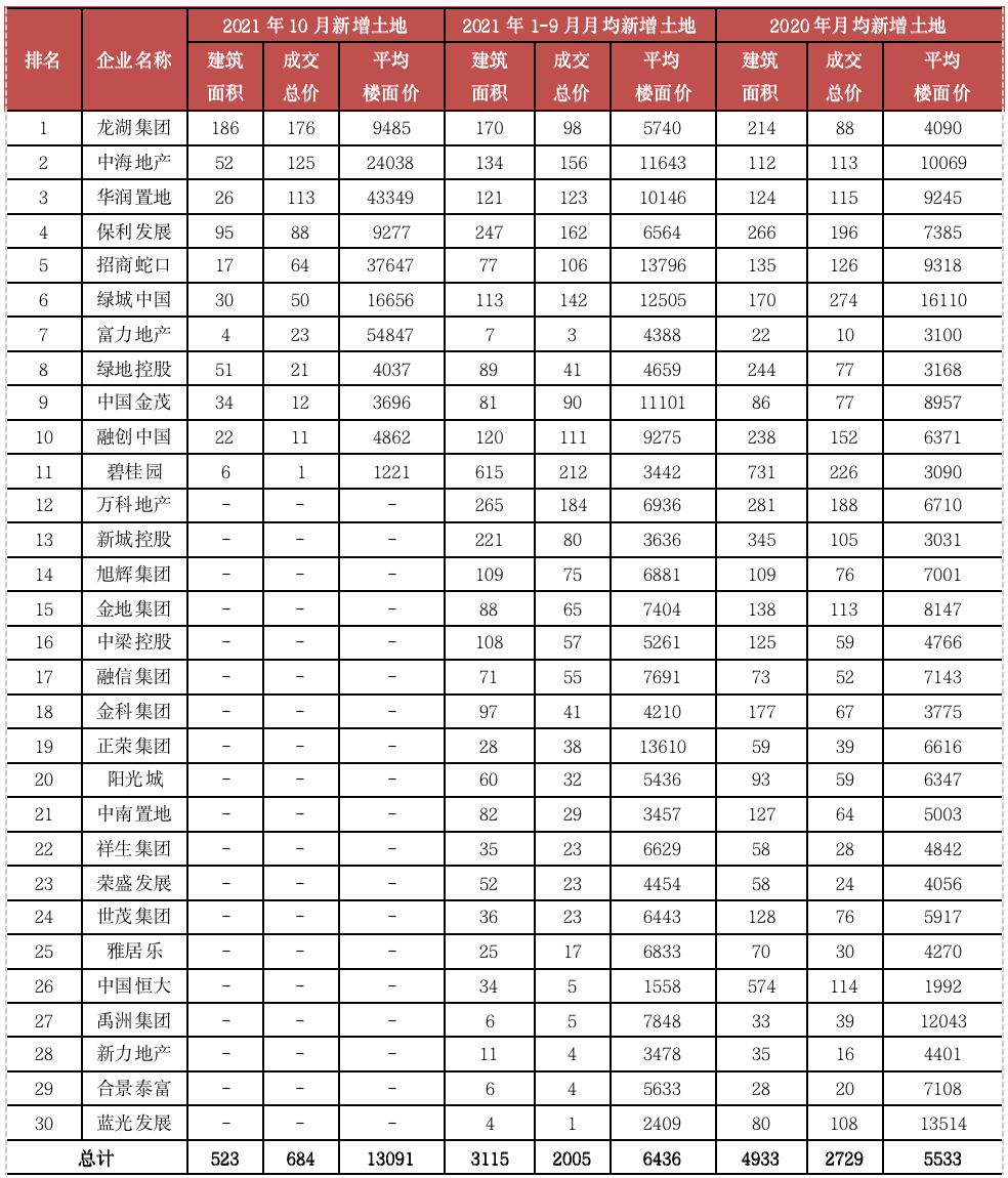 表:2021年10月30家監(jiān)測(cè)企業(yè)新增土地統(tǒng)計(jì)表(單位:萬(wàn)平方米、億元、元/平方米)