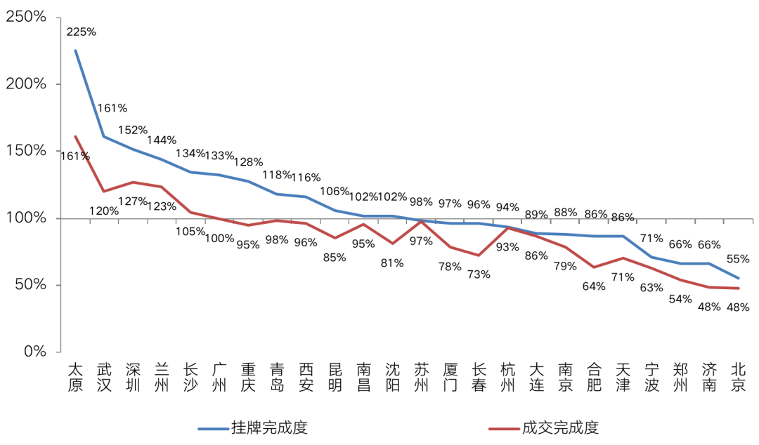 各個城市供地完成情況基本一致,基本呈現(xiàn)中西部城市“超標”、而樓市下行城市供地不足的分化格局。