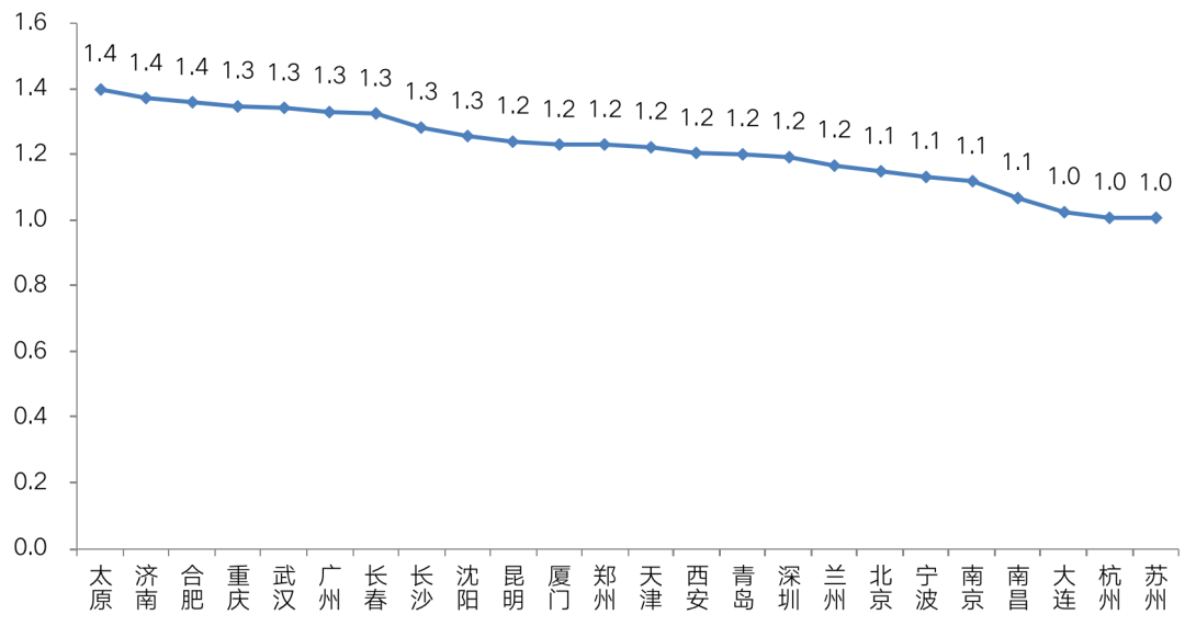 相比之下,杭州、寧波、南昌等供求比較均衡(供求比均在1.1及以下)的城市,流拍率則處于相對較低水平,溢價率也處于相對高位。典型如杭州,2020年涉宅土地流拍率(按幅數(shù))僅有2%,而溢價率卻高達21%,土地市場熱度明顯高于供求比較高的城市。