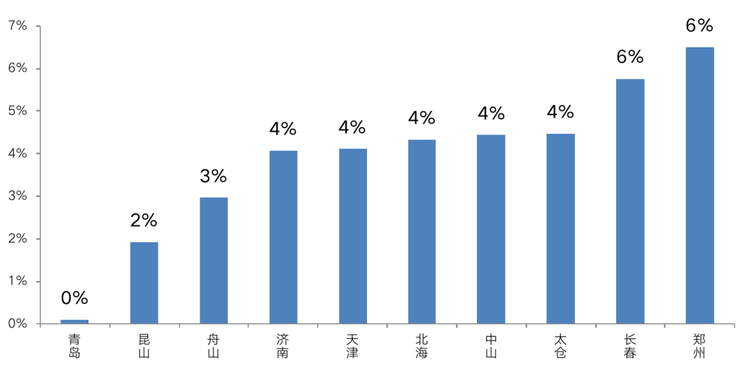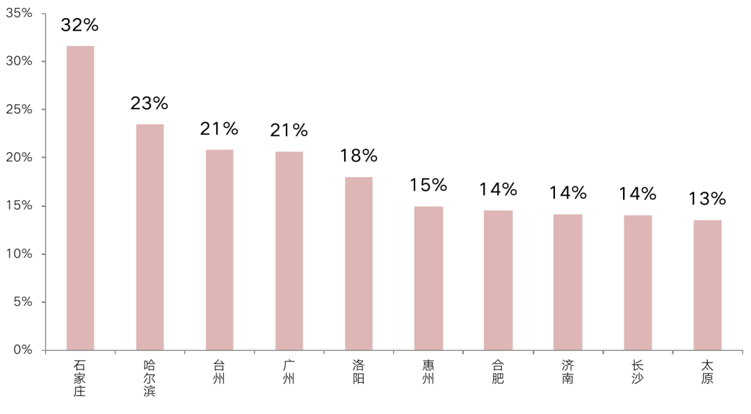 分城市來看,24個重點一二線城市中供求比超1.3的城市達到了三成,其中太原、濟南、合肥等城市表現(xiàn)尤為突出,供求比均超1.35,土地流拍占比相對較高。CRIC監(jiān)測的重點城市流拍數(shù)據(jù)(按幅數(shù))顯示,三城均是流拍率TOP10城市,流拍率都超過了12%,均是流拍的“重災區(qū)”。即便是成交地塊,溢價率水平也相對較低,以今年商品房市場表現(xiàn)欠佳的濟南為例,涉宅土地溢價率僅有4%,多宗土地為底價成交,土地市場非常蕭條。