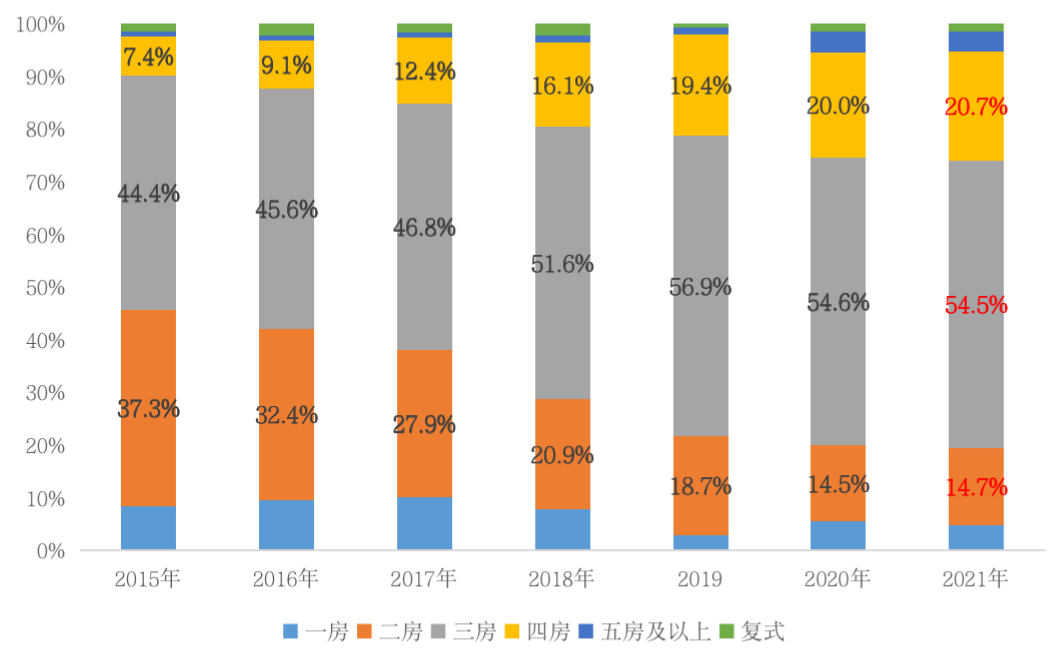 圖:2015-2021年194個(gè)樣本城市分戶型成交套數(shù)占比