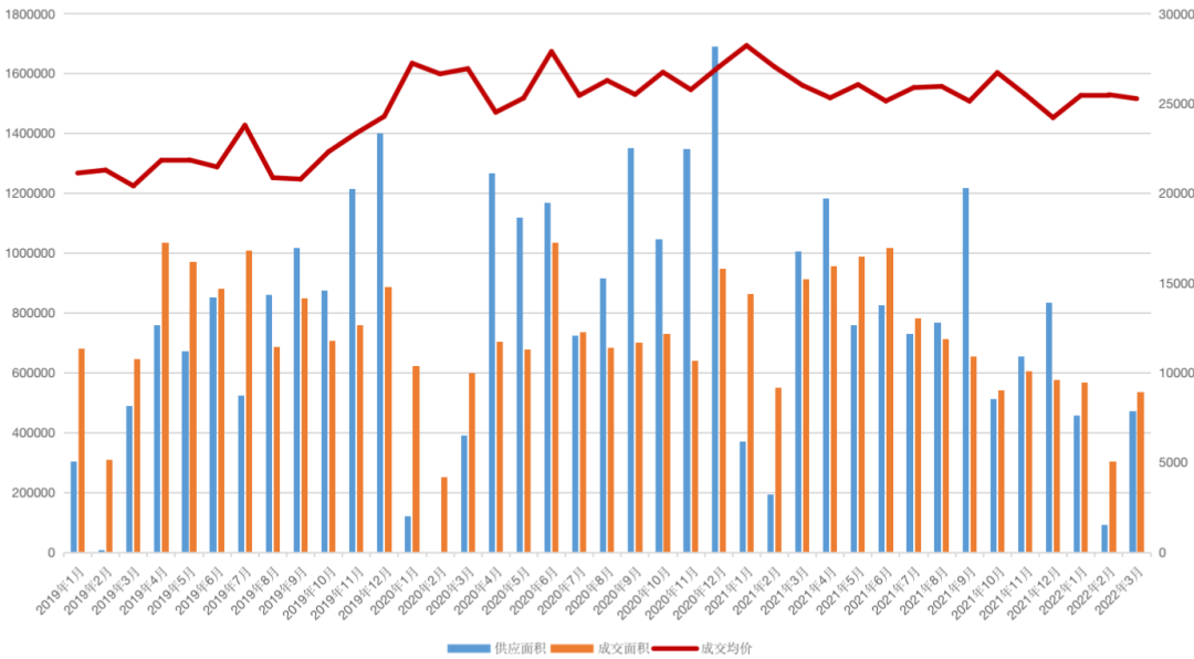 圖:2019年1月至2022年3月蘇州新建商品住宅供求量?jī)r(jià)(單位:平方米、元/平方米)