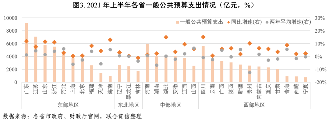 2021年上半年,各省一般公共預算支出分化程度與收入情況相比較小,東北和西北地區省份支出規模普遍較低。廣東一般公共預算支出規模最大,超過8000億元,江蘇、山東、浙江、河南和四川超過5000億元,海南、青海、西藏和寧夏一般公共預算支出規模不足1000億元。