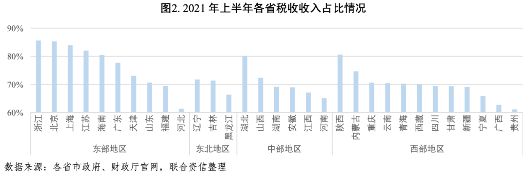 2021年上半年,各省財政收入質量存在分化,超半數省份稅收占比在65%~75%之間。一般情況下稅收占比的水平與經濟發展程度匹配程度較高,但也會受到各地的征收非稅費用水平、財政收支管理等方面的影響。浙江、北京、上海、江蘇、海南、湖北和陜西的稅收比重超過80%,財政收入含金量較高,非稅收入占比較低,營商環境良好;而經濟大省中,廣東、山東稅收比重不到80%,四川、福建、河南不到70%;河北和貴州最低,僅為61%,財政收入質量相對較差,需要進一步加強財政收支管理,加強收入調度和稅費征管,優化營商環境,確保財政收入持續穩定增長。