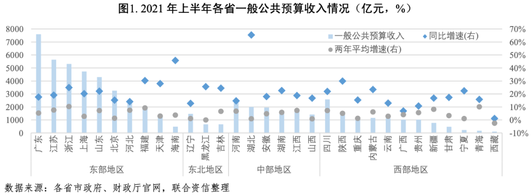 2021年上半年各省一般公共預算收入均實現正增長,由于上年同期基數較低,近一半地區實現了20%以上的增速;剔除基數效應后,僅黑龍江和西藏一般公共預算收入規模仍未達到2019年同期水平。其中湖北一般公共預算收入同比增速為65.43%,主要是2020年上半年的疫情導致財政收入出現斷崖式下滑、同期基數過低所致。