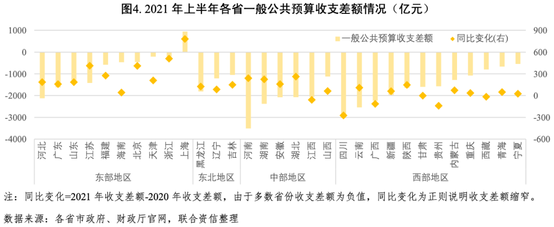 上半年大部分省份一般公共預算收支差額同比有所收窄,只有江西、四川、廣西、甘肅、貴州和西藏6個省份收支差額進一步擴大,財政收支平衡壓力上升。