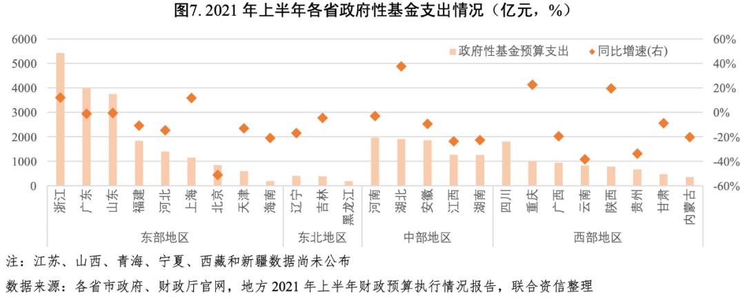 上半年各區域政府性基金收入規模分化程度較大,土地市場呈現“量縮價漲”的特點,在“雙集中”供地以及樓市調控政策的影響下,房地產企業拿地資金更集中于熱點城市,未來土地市場分化程度或將進一步加大。由于上年同期基數普遍較低,公布數據的25個省份除黑龍江外均實現正增長,13個省份實現20%以上的增速,其中浙江、廣東、山東等地在基數較大的情況下仍呈高速增長態勢。受上半年專項債發行滯后拖累,多數省份政府性基金預算支出同比有所下降,僅浙江、上海、湖北、重慶和陜西5個省份實現正增長。