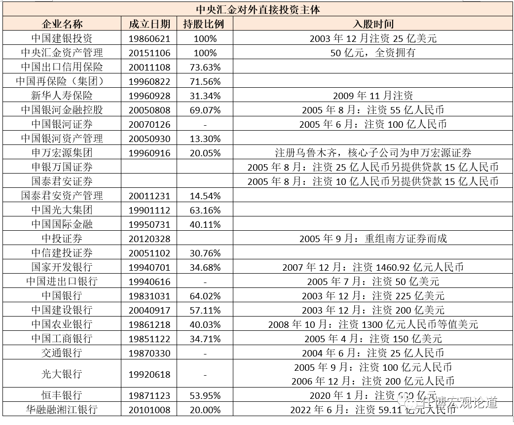 (三)目前中中央匯金控參股6家銀行(國開行、工行、農行、中行、建行與恒豐銀行);參股中金和中信建投2家券商,并通過申萬宏源集團控股申萬宏源證券,通過銀河金控控股銀河證券;控參股保險公司為中國信保、中再集團和新華人壽;控參股光大集團、中國建投和銀河金控等等3家綜合類機構。