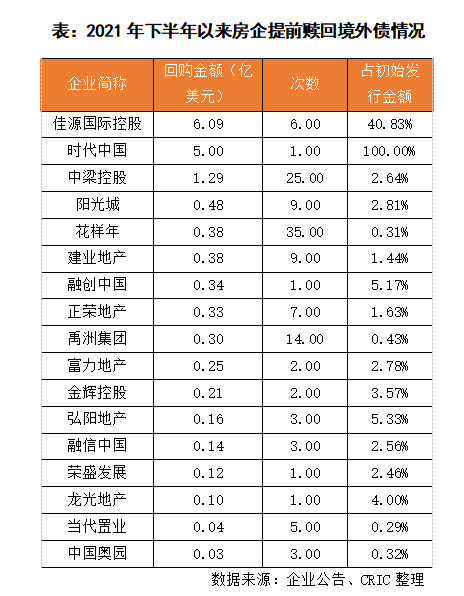在此背景下,境外債券市場重現(xiàn)回購潮,據(jù)不完全統(tǒng)計,2021年下半年以來,18家房企陸續(xù)實行境外債回購舉動,回購次數(shù)超過100次,從贖回數(shù)額來看,房企累計回購境外債券及票據(jù)涉及資金合計15.6億美元,占初始發(fā)行金額4.07%。