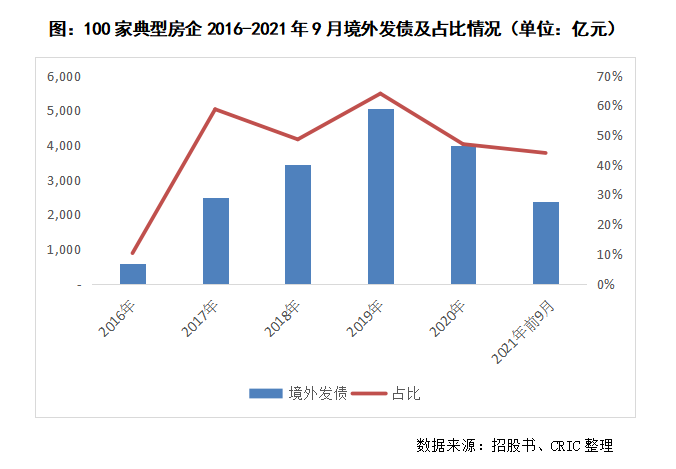 自2017年房企廣泛發(fā)行境外美元債以來,境外發(fā)債逐步成為房企融資方式里面的重要組成部分,融資量逐年上漲,到2019年100家房企境外發(fā)債達到高峰,融資量約達到5052億元,占所有發(fā)債總量的64%。但值得注意的是,2020年疊加疫情全球擴散美元債市場動蕩,以及三條紅線出臺等多重原因,境外發(fā)債方面有所收縮,融資量約為3998億元,同比下降21%,其在企業(yè)發(fā)債的占比也同比下降了17個百分點至47%。2021年前9月,房企境外發(fā)債2379億元,同比下降24%,占比也同比下降了2個百分點至44%,境外債券發(fā)行進一步收緊。