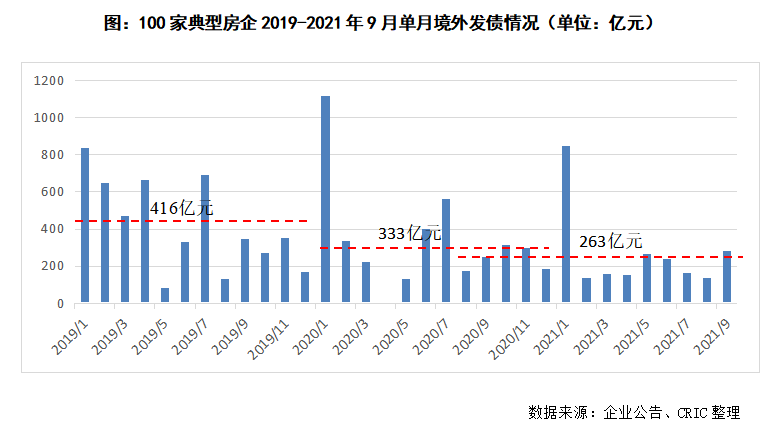 而2021年以來,房企債務(wù)違約事件增加,且逐步蔓延至頭部房企,同時違約產(chǎn)品從此前的信托貸款等非標產(chǎn)品,蔓延到境內(nèi)公募債違約,從而引發(fā)公募債券的信用風險;而疊加房貸兩集中等政策的影響,境外投資者對未來房地產(chǎn)行業(yè)的發(fā)展有所擔憂,是以近期房企境外發(fā)債市場波動較大,房企境外新債發(fā)行受阻。2021年前九月房企境外發(fā)債融資額僅占2021年全年到期金額的75%,72%的房企新發(fā)行債券小于2021年到期債券總額,而2020年前九月境外發(fā)債是2020年全年到期金額的2.42倍,彼時僅有43%的企業(yè)發(fā)行新債低于到期債券。