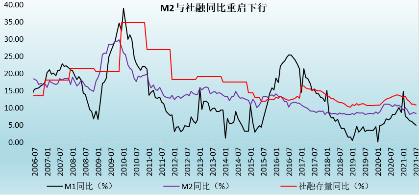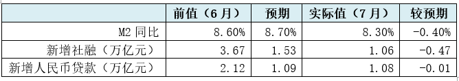 2021年8月11日(周三),央行發(fā)布7月金融統(tǒng)計數(shù)據(jù),新增社融與新增人民幣貸款、M2同比增速均不及預(yù)期。2021年7月,新增社會融資規(guī)模和新增人民幣貸款分別為1.06萬億和1.08萬億,較預(yù)期分別少增0.47萬億和0.01萬億,在近五年的7月新增數(shù)據(jù)中也明顯處于低位(2017-2020年的7月新增社融分別為2.12萬億、1.84萬億、1.29萬億和1.69萬億)。同時,2021年7月M2同比降至8.30%,較預(yù)期值大幅下挫0.40個百分點。