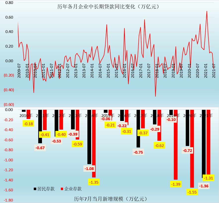 歷年7月的客戶存款一般均會呈現(xiàn)大幅減少的季節(jié)性,如2017-2020年的7月,居民存款分別減少0.75萬億、0.29萬億、0.10萬億、0.72萬億和1.36萬億,企業(yè)存款分別減少0.37萬億、0.62萬億、1.39萬億、1.55萬億和1.31萬億。但是就今年7月來,居民存款的低迷又明顯超預(yù)期,這應(yīng)與居民貸款低迷、貸款派生存款力度明顯減弱有關(guān)。