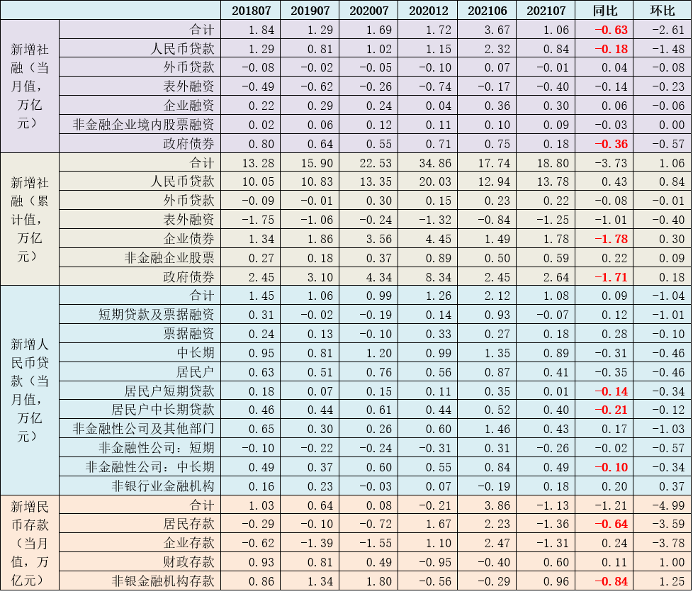2021年7月,新增社會融資規(guī)模達到1.06萬億,同比和環(huán)比分別大幅少增0.63萬億和2.61萬億。其中,新增人民幣貸款、新增未貼現(xiàn)票據(jù)和新增政府債券同比分別少增0.18萬億、0.12萬億和0.36萬億,三者合計共拖累社融少增0.66萬億,可以看出政府債券拖累最為明顯,主因應(yīng)是政府發(fā)行節(jié)奏放緩。