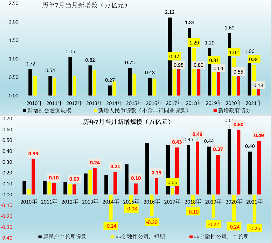 那么央行短期內(nèi)會不會放松政策來支撐社融呢?我們認為央行可能還會觀察一段時期,再等等看。因為從央行的視角來看,今年1-7月新增社融和新增人民幣貸款分別達到18.80萬億和13.78萬億,雖然較2020年同期分別少增-3.73萬億和多增0.43萬億,但較2019年同期仍分別多增2.90萬億和2.95萬億,因此絕對值上看似乎并不低。現(xiàn)在市場可能更關(guān)心的是,監(jiān)管政策層面會不會有所放松?如地產(chǎn)和城投政策層面,目前來看這種可能性應(yīng)該是存在的,雖然不會允許新增,但基于存量債務(wù)化解的信貸支持應(yīng)該是有商量空間的,畢竟若實體經(jīng)濟出現(xiàn)流動性危機,屆時再出手拯救的難度會大幅提升。