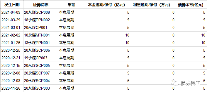 自2020年11月10日“20永煤SCP003”首次債券違約之后,永煤集團(tuán)目前已經(jīng)對(duì)11只債券進(jìn)行了展期,債券展期金額合計(jì)為65億元。永煤集團(tuán)最新的主體信用評(píng)級(jí)為B(中誠(chéng)信國(guó)際)。