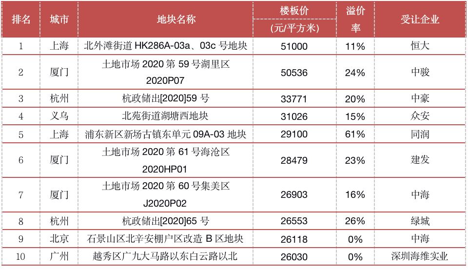 具體來看,單價最高地塊為上海北外灘核心區的稀缺含宅地塊,土地價值極高,最終由恒大以51000元/平方米的價格競得,溢價率11%;門檻地塊位于廣州越秀區,平均樓板價為26030元/平方米。