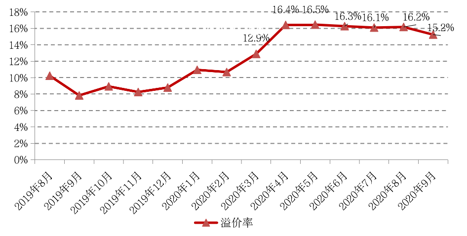 CRIC監測數據顯示,9月的溢價率環比8月下降1個百分點,降至15.2%,并創下今年4月以來新低。