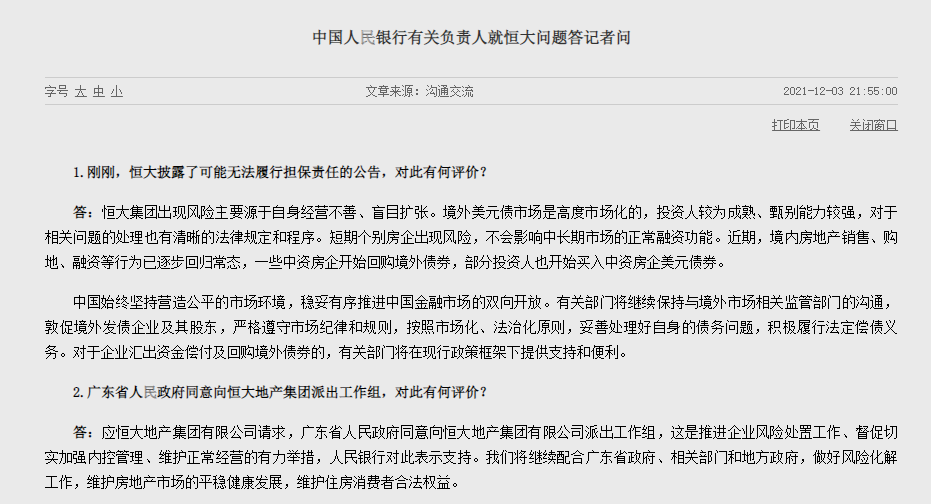 在上一個(gè)工作日的晚上,也就是恒大違約公告的當(dāng)晚,央行官網(wǎng)就專門發(fā)布了央行有關(guān)負(fù)責(zé)人對(duì)恒大問題的看法,并明確提到: