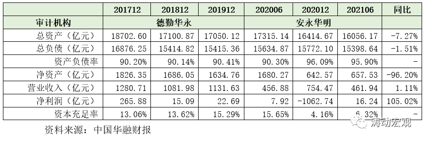 1、2018年以來,華融資產開始進入縮表模式,總資產由2017年底的1.87萬億降至今年6月底的1.61萬億(收窄0.26萬億)。與之相對應,華融資產的凈資產亦從2018年的1826億元大幅降至今年6月底的658億元(收窄1168億元),資產負債率亦大幅升至96%附近,雖然金融資產管理公司的資產負債率本身就很高(一般在85-90%左右),但比商業銀行還要高,這著實難以理解。