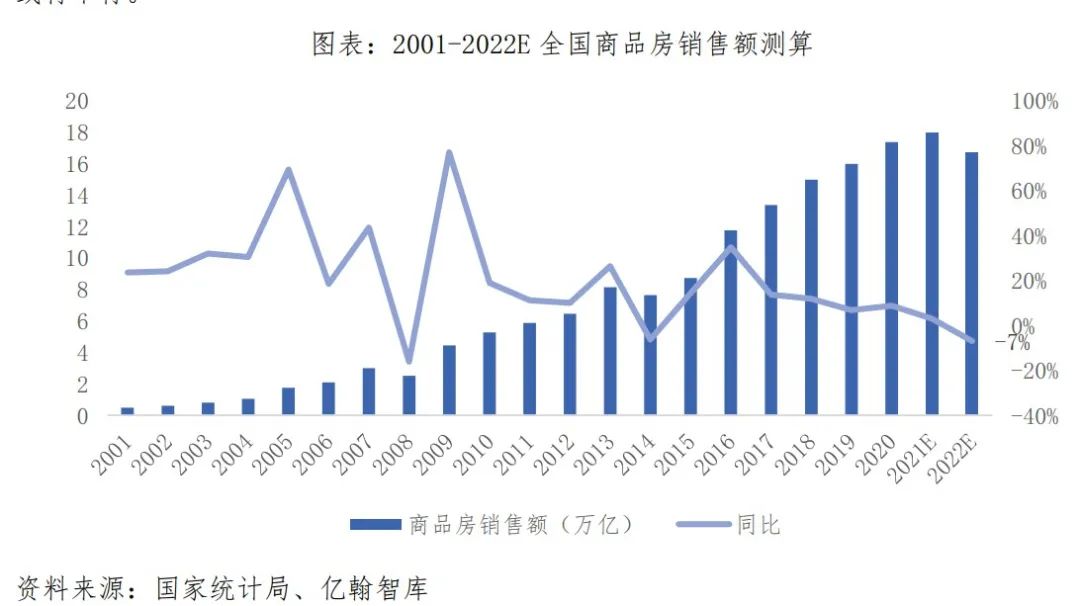 2001年以來,房地產(chǎn)開發(fā)投資同比增速從未出現(xiàn)過負(fù)增長,最差的一年出現(xiàn)在2015年,同比增速為0.9%。但是在隨著新開工預(yù)期的下降,商品房市場成交量預(yù)期看衰,開發(fā)投資或?qū)⒃?022年首次出現(xiàn)負(fù)增長。