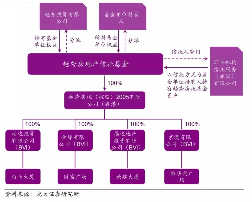 3)設(shè)立地產(chǎn)信托REIT。匯豐機構(gòu)信托服務(wù)(亞洲)有限公司作為信托人和管理人將越秀房托(控股)2005限公司(香港)間接持有的四項國內(nèi)物業(yè)資產(chǎn)設(shè)立越秀房地產(chǎn)信托基金金。于2005年12月7日訂立信托契約,成立香港房地產(chǎn)信托基金——越秀房產(chǎn)信托基金。