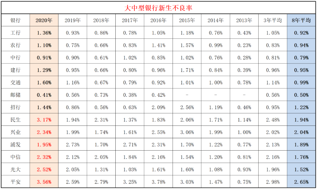 2、2020年新生不良率情況。郵儲(chǔ)銀行0.41%,中行是0.91%,農(nóng)行是1.10%,建行是1.29%,工行是1.36%,招行是1.44%,交行是1.60%,浦發(fā)銀行是1.95%,中信銀行是2.32%,興業(yè)銀行是2.34%,光大銀行是2.52%,民生銀行是3.17%,平安銀行是3.56%。