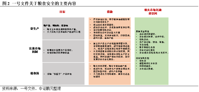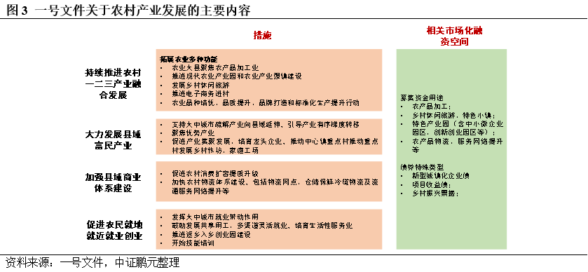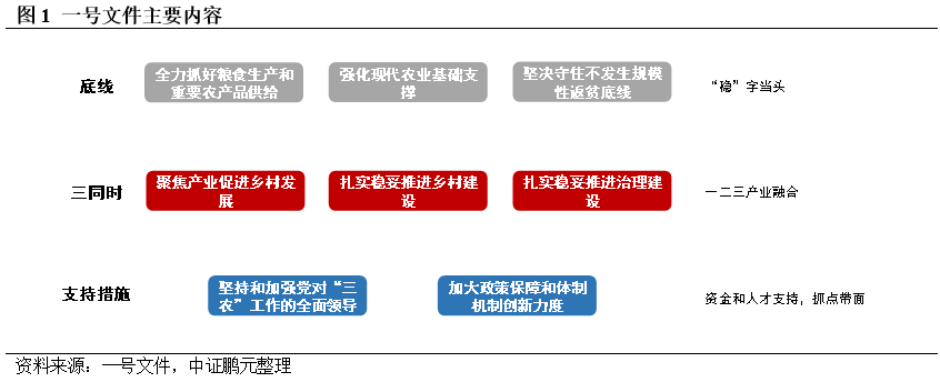 一號(hào)文件:一號(hào)文件指出,鄉(xiāng)村振興要守住保障國(guó)家糧食安全和不發(fā)生規(guī)模性返貧兩條底線,文件共分8個(gè)部分,其中,(1)第1-3章,主要說明政策基調(diào)“穩(wěn)”字當(dāng)頭,包括全力抓好糧食生產(chǎn)和重要農(nóng)產(chǎn)品供給,強(qiáng)化現(xiàn)代農(nóng)業(yè)基礎(chǔ)支撐,堅(jiān)決守住不發(fā)生規(guī)模性返貧底。其中,“不發(fā)生規(guī)模性返貧”是扶貧攻堅(jiān)轉(zhuǎn)向鄉(xiāng)村振興的重要環(huán)節(jié),為鄉(xiāng)村振興工作構(gòu)建扎實(shí)基礎(chǔ)。(2)第4-6章,具體介紹了鄉(xiāng)村振興的三個(gè)領(lǐng)域,包括鄉(xiāng)村發(fā)展、鄉(xiāng)村建設(shè)和鄉(xiāng)村治理,其核心為“促進(jìn)一二三產(chǎn)業(yè)融合”,以二三產(chǎn)業(yè)促進(jìn)農(nóng)業(yè)實(shí)現(xiàn)轉(zhuǎn)型升級(jí),同時(shí)形成產(chǎn)業(yè)效應(yīng),發(fā)展經(jīng)濟(jì)、帶動(dòng)就業(yè),同時(shí)推進(jìn)鄉(xiāng)村基礎(chǔ)設(shè)施改造升級(jí),推進(jìn)數(shù)字鄉(xiāng)村、綠色鄉(xiāng)村、和諧鄉(xiāng)村的建設(shè)。(3)第7-8章,明確政策支持措施,包括擴(kuò)大鄉(xiāng)村振興財(cái)政資金投入、強(qiáng)化鄉(xiāng)村振興金融服務(wù)和人才隊(duì)伍建設(shè),以及積極推動(dòng)農(nóng)村經(jīng)濟(jì)發(fā)展新模式的探索。