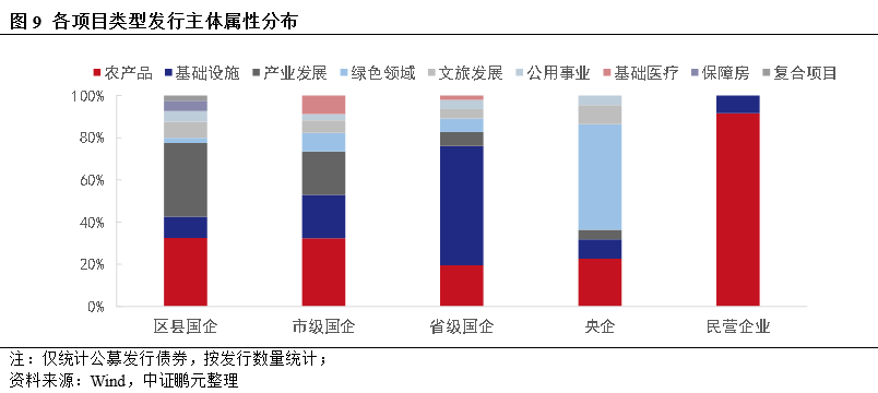 結(jié)合企業(yè)屬性來看:第一,區(qū)縣國(guó)企。主要承擔(dān)產(chǎn)業(yè)園區(qū)建設(shè)、農(nóng)貿(mào)市場(chǎng)以及公用事業(yè)項(xiàng)目。此類項(xiàng)目,建設(shè)難度相對(duì)較低,但對(duì)運(yùn)營(yíng)的要求較高,需要關(guān)注運(yùn)營(yíng)期的預(yù)期收入情況。第二,市級(jí)國(guó)企。主要承接農(nóng)產(chǎn)品收儲(chǔ),其次,是公路建設(shè)和產(chǎn)業(yè)園區(qū),其中公路建設(shè)以償還相關(guān)債務(wù)為主。第三,省級(jí)國(guó)企。主要負(fù)責(zé)高速公路建設(shè),其次是農(nóng)產(chǎn)品收儲(chǔ)。第四,央企。主要承接綠色領(lǐng)域項(xiàng)目,主要包括太陽(yáng)能、風(fēng)力發(fā)電等新能源項(xiàng)目,其次是農(nóng)產(chǎn)品收儲(chǔ)、流通,主要是農(nóng)業(yè)產(chǎn)業(yè)化龍頭企業(yè),例如,中糧集團(tuán)、蒙牛等。第五,民營(yíng)企業(yè),主要是農(nóng)業(yè)產(chǎn)業(yè)化龍頭企業(yè),例如,新希望、金龍魚、伊利,以及德邦,募集資金用于農(nóng)產(chǎn)品收購(gòu)和物流建設(shè)。
