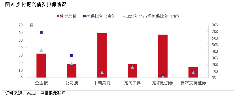 鄉(xiāng)村振興債券的擔(dān)保比例相對(duì)來說高于全市場(chǎng)平均水平,其中,有擔(dān)保債券39只,占比19.7%。分債券類型看,企業(yè)債和公司債的擔(dān)保比例明顯高于市場(chǎng)平均水平。