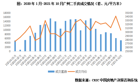 受到增值稅征免年限調整、房貸額度管控等影響,5月以來,廣州二手房成交量拾級而下。4月,廣州市9區(qū)住宅銷售增值稅征免年限由2年提高至5年,增加了二手房交易成本,導致5月以來掛牌量顯著下降,6月二手房成交罕見跌破1萬套,同比驟降34%,8月末廣州發(fā)布二手房指導價,9月二手房成交量應聲下跌,僅為6191套,同、環(huán)比分別下滑56%和27%,10月,二手房成交環(huán)比繼續(xù)跌16%。