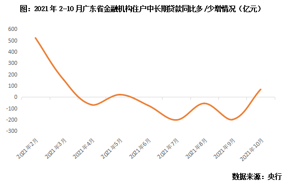 視角延伸到廣東全省,10月廣東居民中長期貸款同比止跌回升,但反彈幅度較為有限。具體而言,2021年10月,廣東住戶部門中長期貸款增加651億元,環(huán)比少增117億元,同比多增67億元,一改6月以來連續(xù)4個月同比少增的走勢,但反彈幅度仍然比較有限。