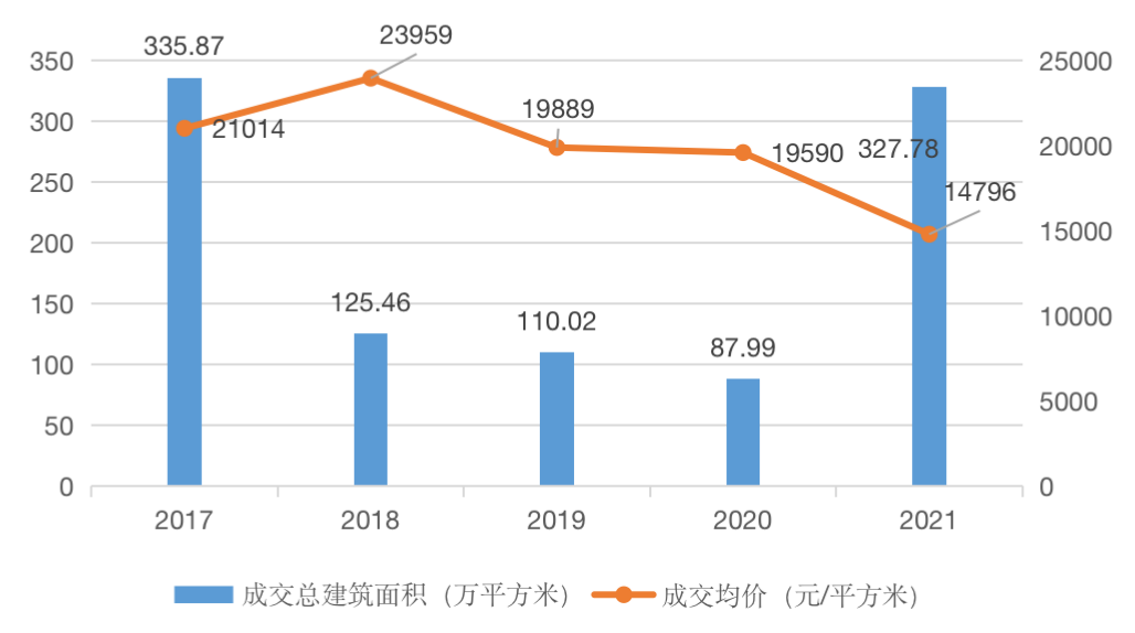 圖:重點(diǎn)8城2017年7月-2021年10月自持用地年度成交走勢(shì)