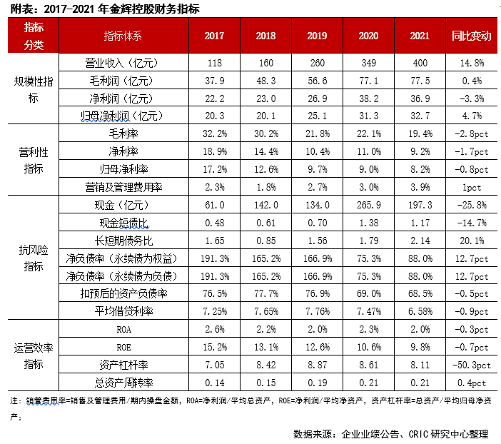 盈利能力方面,2021年金輝毛利潤同比微增0.45%至77.47億元,綜合毛利率同比減少2.8pct至19.36%,緣于土拍市場獲取的高溢價地塊陸續進入結轉所致。年內凈利潤同比下跌3.28%至36.94億元,實現凈利率同比減少1.7pct至9.23%。除受毛利影響外,凈利指標下跌主要由于合聯營投資收益與其他凈收益減少,以及銷管費用率的抬升所致。2021年金輝銷管費用率(/操盤金額)從去年同期的2.99%顯著增加至3.95%,未來仍需加強內部運營中降本控費力度。